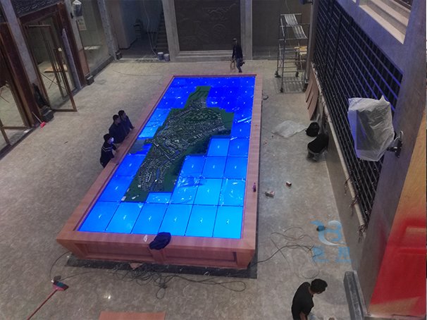 中間使用沙盤模型周圍采取拼接屏,拼接屏播放沙盤周邊風(fēng)景,更好的與沙盤結(jié)合。當(dāng)選擇好區(qū)域拼接墻播放相關(guān)視頻內(nèi)容