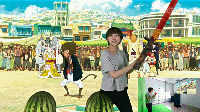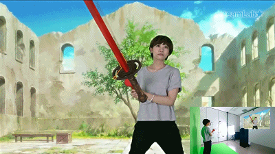 舉起雙掌Kinect體感攝像頭識別參與游戲者。通過現(xiàn)代科技摳像技術(shù)把參與者完美的和游戲場景融合,有趣的是參與者手拿刀靶,在屏幕中玩家手中的刀靶卻成為一把真實(shí)的寶刀。