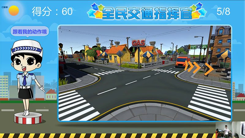 玩家通過跟著左邊的小交警擺出指定的安全交通手勢,如果擺出的手勢正確,則進入下一個姿勢,反之則會出現(xiàn)交通擁擠混亂?梢杂脕砦∨笥亚皝眢w驗,讓他們學會交通安全的同時,也吸引了家長前來。