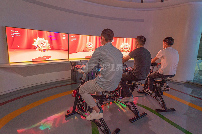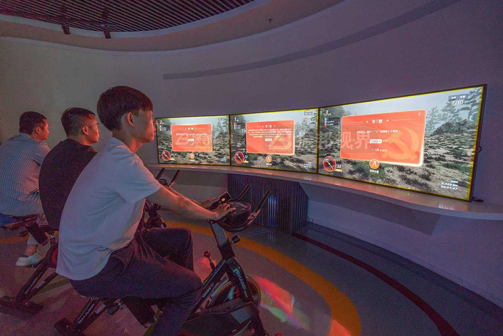 重走長征路版-AR互動系統(tǒng)由AR 互動單車、顯示幕墻及控制系統(tǒng)組成,系統(tǒng)通過3D立體場景建模技術真實還原了紅軍長征路上的血戰(zhàn)湘江、遵義會議、四渡赤水、飛奪瀘定橋、爬雪山、過草地的六大場景,體驗者通過虛擬騎行身臨其境的體驗重走長征路,每體驗完一個場景,系統(tǒng)自動出10道題,體驗者限時答題,體驗完成系統(tǒng)自動生成成績排行榜,可以局域網(wǎng)組團競技,體驗者可直接通過微信賬號登錄,成績跟微信賬號關聯(lián)計入全國排名。