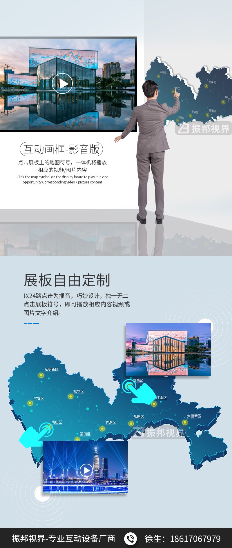 影音版的互動畫框則由展板+顯示屏一體機組成。參展觀眾通過點擊展板上的地圖符號,一體機將播放相應(yīng)的視頻或圖片內(nèi)容。展板可自由定制,分24路點擊播音。