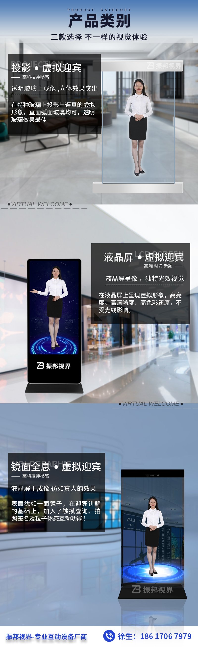 新款虛擬迎賓分為液晶款、投影款和鏡面全息三款迎賓方式。