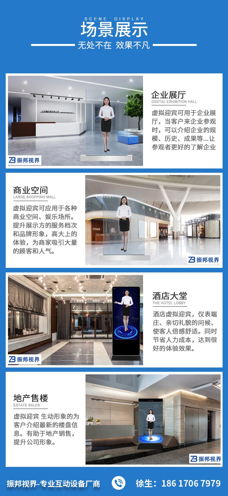 虛擬迎賓是振邦視界新推出的一款可取代傳統(tǒng)真人講解、富有高科技感的互動產(chǎn)品,當(dāng)參觀者進(jìn)入紅外感應(yīng)區(qū),屏幕自動切換宣傳片,展現(xiàn)出虛擬人物迎賓及虛擬人物解說。