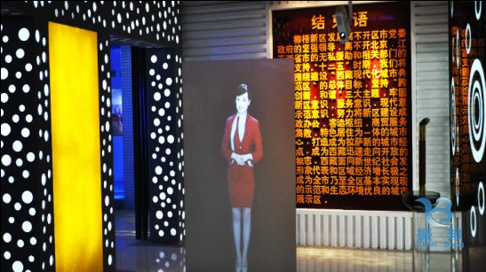 當參觀者走到某個展廳功能區(qū)的紅外感應(yīng)區(qū)域時,互動感應(yīng)系統(tǒng)會發(fā)出指令將導覽員形象投射在特種玻璃屏幕上,形成科幻電影般的空間形象,在參觀的起始階段為觀眾指明參觀方向。