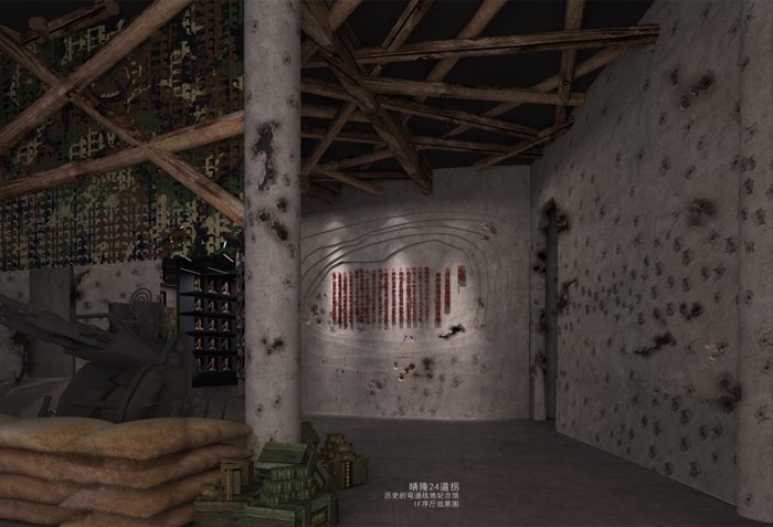 進(jìn)入戰(zhàn)地紀(jì)念館,墻面上貼滿了“槍彈”墻紙,給參觀者還原激烈的戰(zhàn)場印象,配合著裝修環(huán)境的烘托帶出展廳序言交代展廳歷史背景。