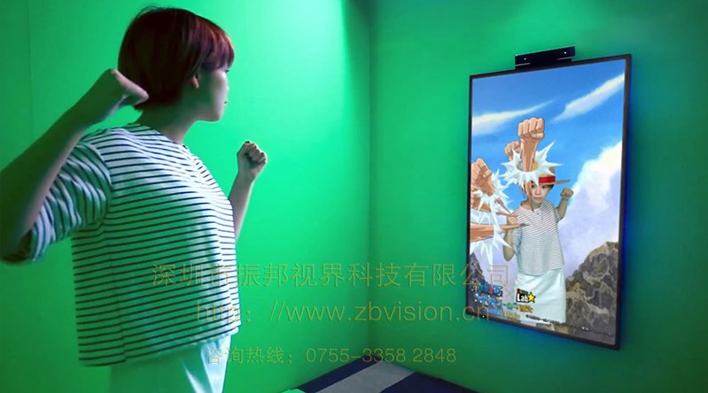 玩家在綠布區(qū)域內站定后,通過手勢移動選擇拍照的背景,進行拍照留念。是利用摳像軟件來完成拍照操作。