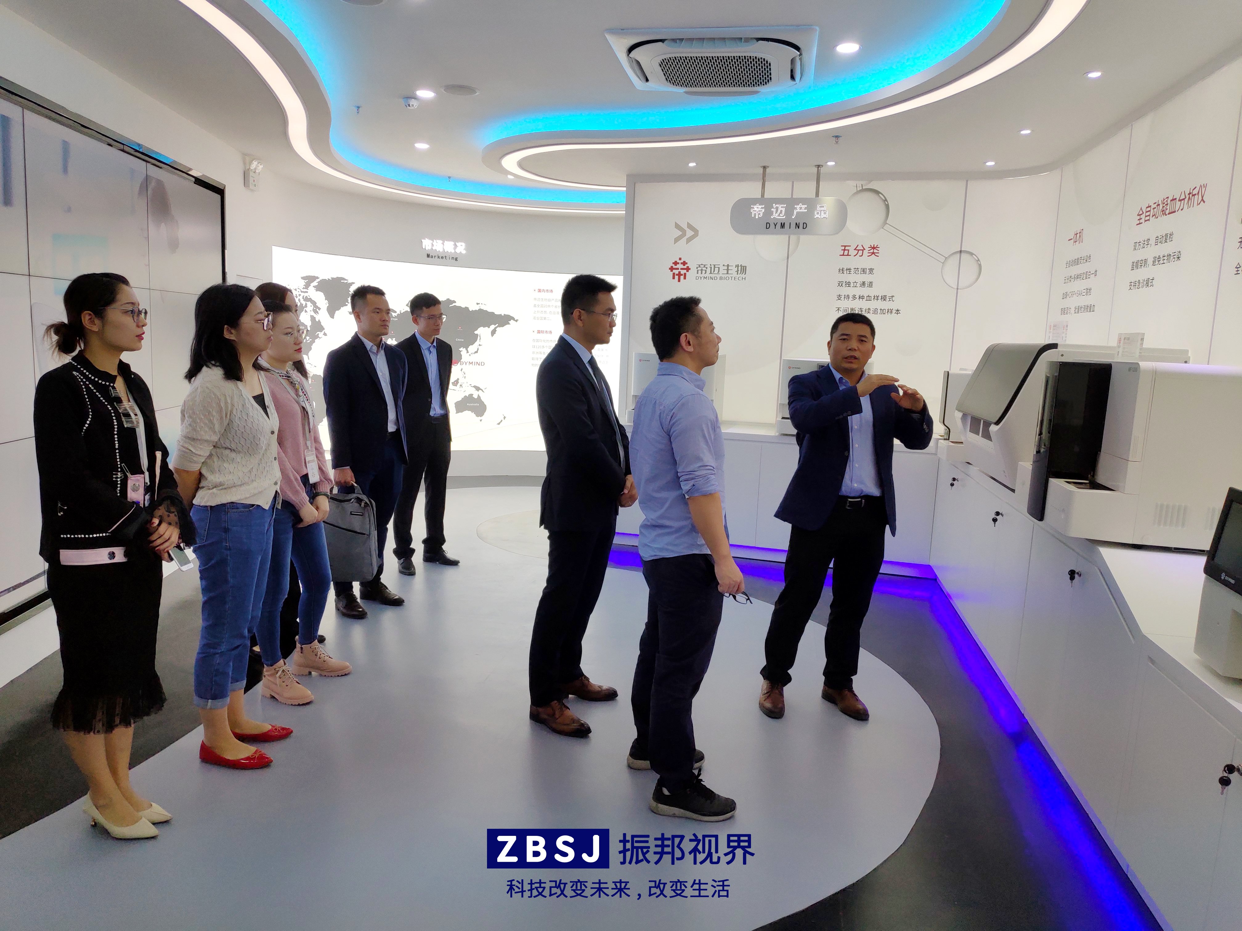 進(jìn)門右轉(zhuǎn)是電動(dòng)滑軌屏、通過移動(dòng)的屏幕展示深圳市帝邁生物技術(shù)有限公司從2013到2019的企業(yè)發(fā)展的歷程。點(diǎn)擊屏幕,可彈出圖文和視頻介紹。