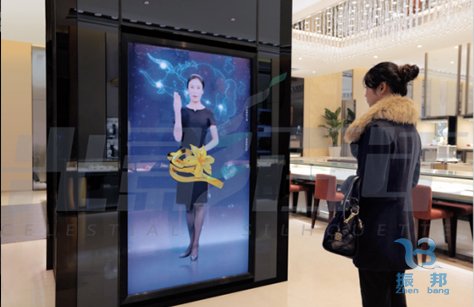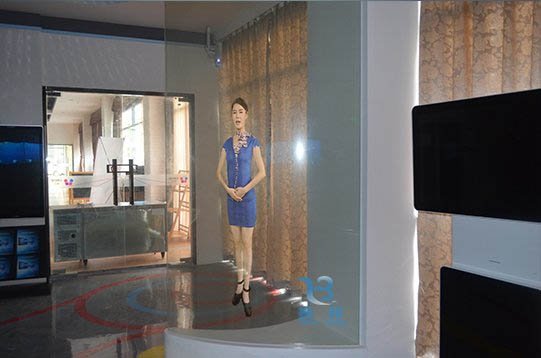 虛擬迎賓,又稱虛擬解說員、虛擬主持、虛擬播音員,是全息投影中的一種,虛擬出逼真的人物形象,當參觀者走到感應區(qū)域時,互動感應系統(tǒng)會將導覽員形象投射在特種玻璃屏幕上,形成科幻電影般的空間形象,歡迎來賓光臨,為參觀者介紹展館的主題分布及特色展區(qū)。