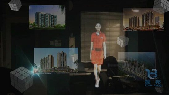運用三維動畫、人機互動紅外感應處理、大屏幕顯示、投影機背投等技術來實現(xiàn),觀眾會看到一個豎立的大屏幕(大屏幕可以用等離子電視機、背投投影幕、投影玻璃、通電玻璃等)上有一位講解員的靜止影像(或是靜態(tài)底圖),當觀眾走到屏幕前時,屏幕中即出現(xiàn)動態(tài)講解員形象,開始為觀眾介紹。