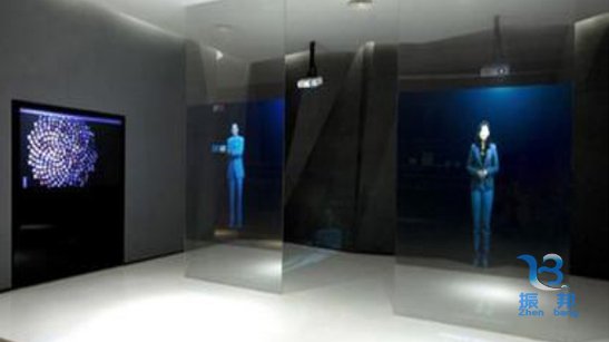 當參觀者走到某個展廳功能區(qū)的紅外感應區(qū)域時,互動感應系統(tǒng)會發(fā)出指令將導覽員形象投射在特種玻璃屏幕上,形成科幻電影般的空間形象,在參觀的起始階段為觀眾指明參觀方向。