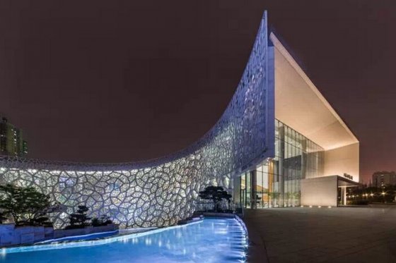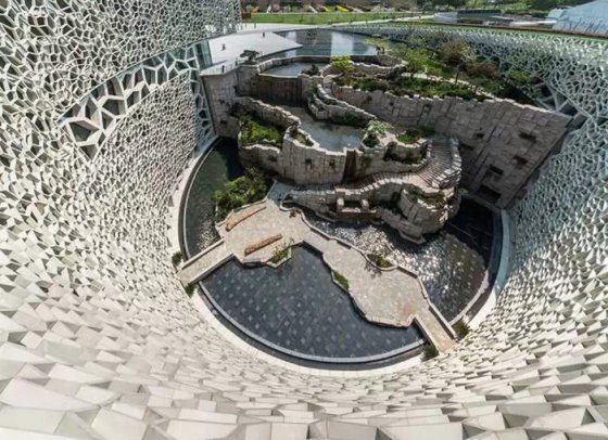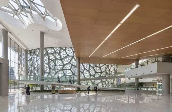 這棟建筑包括展覽空間、一個(gè)4D劇院、一個(gè)戶外展覽花園和一個(gè)30米高的天井,歡迎著參觀者,引人注目的玻璃墻上有著動(dòng)植物圖案的多孔結(jié)構(gòu),充足的自然光線透過(guò)玻璃墻照射進(jìn)來(lái)。