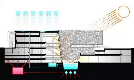 這是一棟生物氣候?qū)W建筑,它通過(guò)使用智能建筑外觀來(lái)應(yīng)對(duì)陽(yáng)光照射,最大化日光,最小化太陽(yáng)能獲得量。橢圓形天井池提供蒸發(fā)冷卻,而建筑內(nèi)的溫度受地?zé)嵯到y(tǒng)的調(diào)節(jié),地?zé)嵯到y(tǒng)使用來(lái)自地面用于加熱和冷卻的能量。