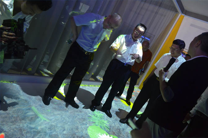 開園當日,寶安區(qū)副區(qū)長胡細銀、中糧智匯創(chuàng)新園總經(jīng)理穆林等在振邦視界總經(jīng)理徐志偉的帶領(lǐng)下,攜innobank創(chuàng)意銀行、深圳市南山海歸聯(lián)誼會眾創(chuàng)空間、中山大學(xué)、華南理工大學(xué)創(chuàng)客基地等9家首批落戶企業(yè),以及來自知名創(chuàng)客圈、智能硬件圈、孵化圈、資本圈、金融圈、平臺圈、媒體圈、公共服務(wù)平臺等近50家單位的代表參觀了由我司與中糧福安公司聯(lián)合打造的硬件體驗中心。其間,受邀嘉賓對所展出的虛擬迎賓,全息成像、投影融合、地面互動、電子簽名、多點觸控、滑軌電視等數(shù)套多媒體數(shù)字展廳新技術(shù)贊不絕口,暢游在互動體驗的樂趣中,感受科技與空間藝術(shù)的完美結(jié)合。