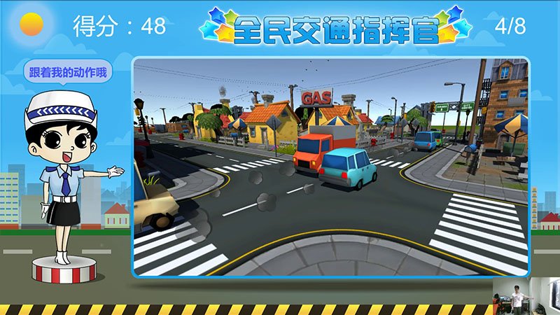 玩家通過跟著左邊的小交警擺出指定的安全交通手勢,如果擺出的手勢正確,則進入下一個姿勢,反之則會出現(xiàn)交通擁擠混亂??梢杂脕砦∨笥亚皝眢w驗,讓他們學會交通安全的同時,也吸引了家長前來。