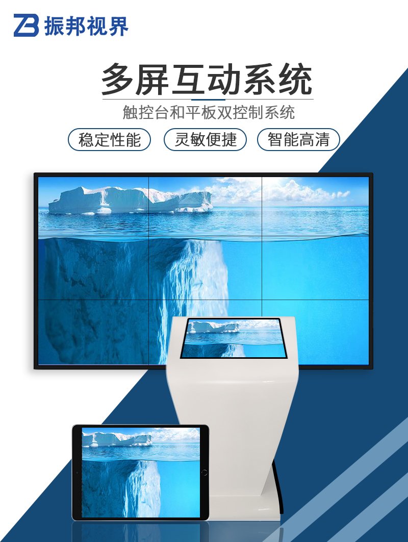 產(chǎn)品簡(jiǎn)介:多屏互動(dòng)是振邦視界推出的一款液晶顯示創(chuàng)意互動(dòng)產(chǎn)品。通過(guò)觸控主屏聯(lián)動(dòng)控制其它屏幕,并且分屏傳輸不同的顯示內(nèi)容,為參觀者展現(xiàn)更為豐富的內(nèi)容,帶來(lái)全新的互動(dòng)展現(xiàn)形式。