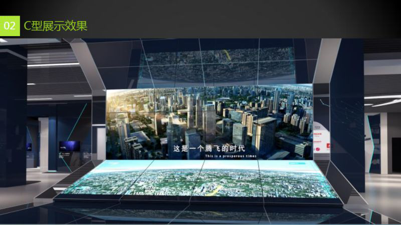 C型沙盤也稱為折幕沙盤,顯示區(qū)域分為墻面和地面兩部分,利用投影機或者顯示屏將兩個區(qū)域打滿,并將兩組畫面相互銜接,形成C型的完整一體畫面。同樣該方案中,需要加入透視效果處理手段,將墻面視角與地面視角完美結(jié)合。