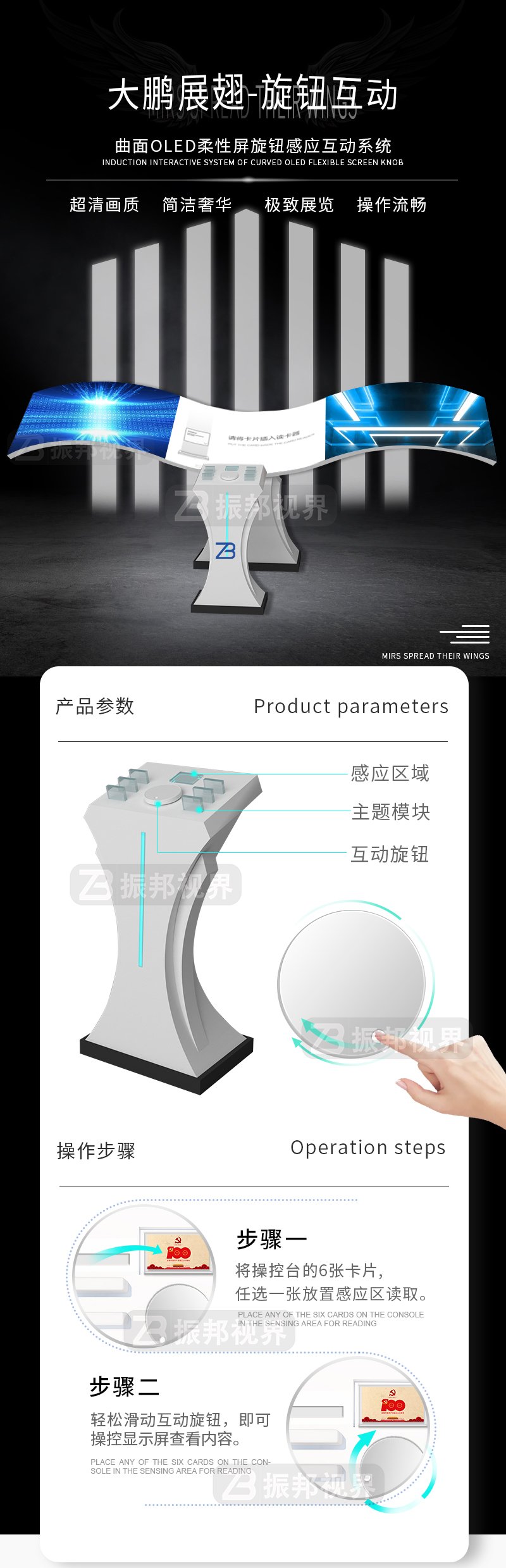 產(chǎn)品簡(jiǎn)介:深圳振邦視界最新研發(fā)的大鵬展翅旋鈕互動(dòng)產(chǎn)品由OLED曲面柔性屏+旋鈕感應(yīng)系統(tǒng)組成??商砑佣鄠€(gè)感應(yīng)模塊內(nèi)容,無(wú)縫銜接的超精細(xì)工藝,讓展覽展示交互體驗(yàn)更加完美!