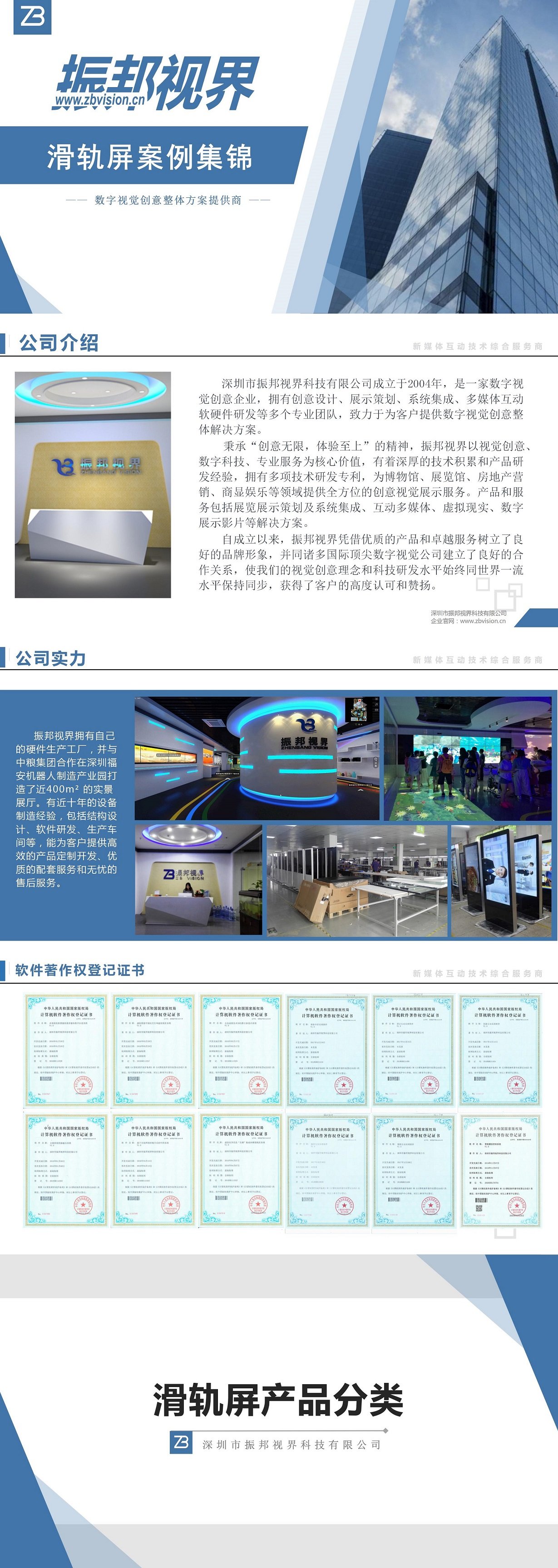 欄目:行業(yè)解決方案更新時間:2020-09-12整理發(fā)布:zbvision.cn已有 33768人查閱 隨著多媒體互動技術(shù)的發(fā)展,以及多媒體展覽展示需求的增多,使滑軌屏互動裝置的應(yīng)用也越來越廣泛。這也讓許多缺乏資質(zhì),及沒有掌握核心技術(shù)的液晶屏廠商紛紛開始擠入這個市場,他們肆意的盜取他人案例,并更改打上自己的水印,并發(fā)布在自己的官網(wǎng)上騙取訂單。利用低價吸引客戶,因報價低廉,客戶往往會選擇跟他們合作,沒有質(zhì)量的保證及完整售后服務(wù)體系,最終結(jié)果只能是客戶吃虧。而作為國內(nèi)專業(yè)滑軌互動裝置的廠家(深圳振邦視界)為嚴(yán)厲打擊抄襲、模仿、盜用案例的現(xiàn)象,也不斷升級改造產(chǎn)品。為讓粉絲客戶能有更多的選擇,振邦視界將現(xiàn)有滑軌屏歸類分為八款,并整理分享一部分已合作的經(jīng)典案例,以供大家參考。